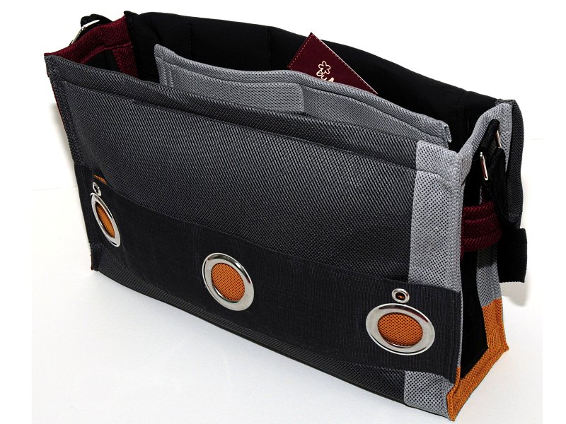 Sie hat im Inneren zwei Einschiebefächer und eine Innentasche mit Reißverschluss.